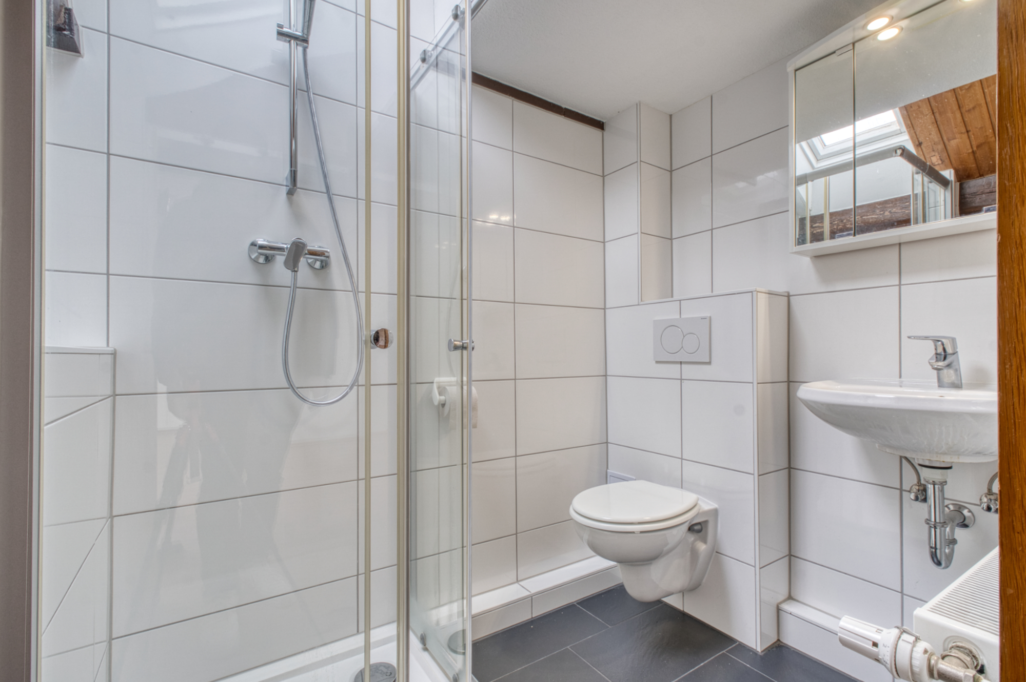 Das Badezimmer wurde vollständig saniert und verfügt über ein Fenster, eine Dusche, ein WC, ein Waschbecken sowie einen Handtuchheizkörper. Ein zusätzlicher, abgetrennter Raum bietet praktischen Stauraum.