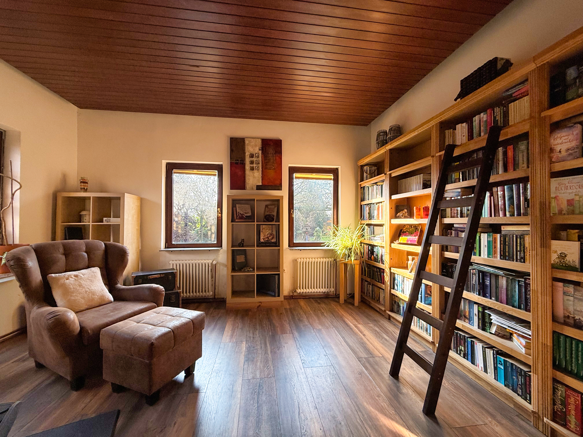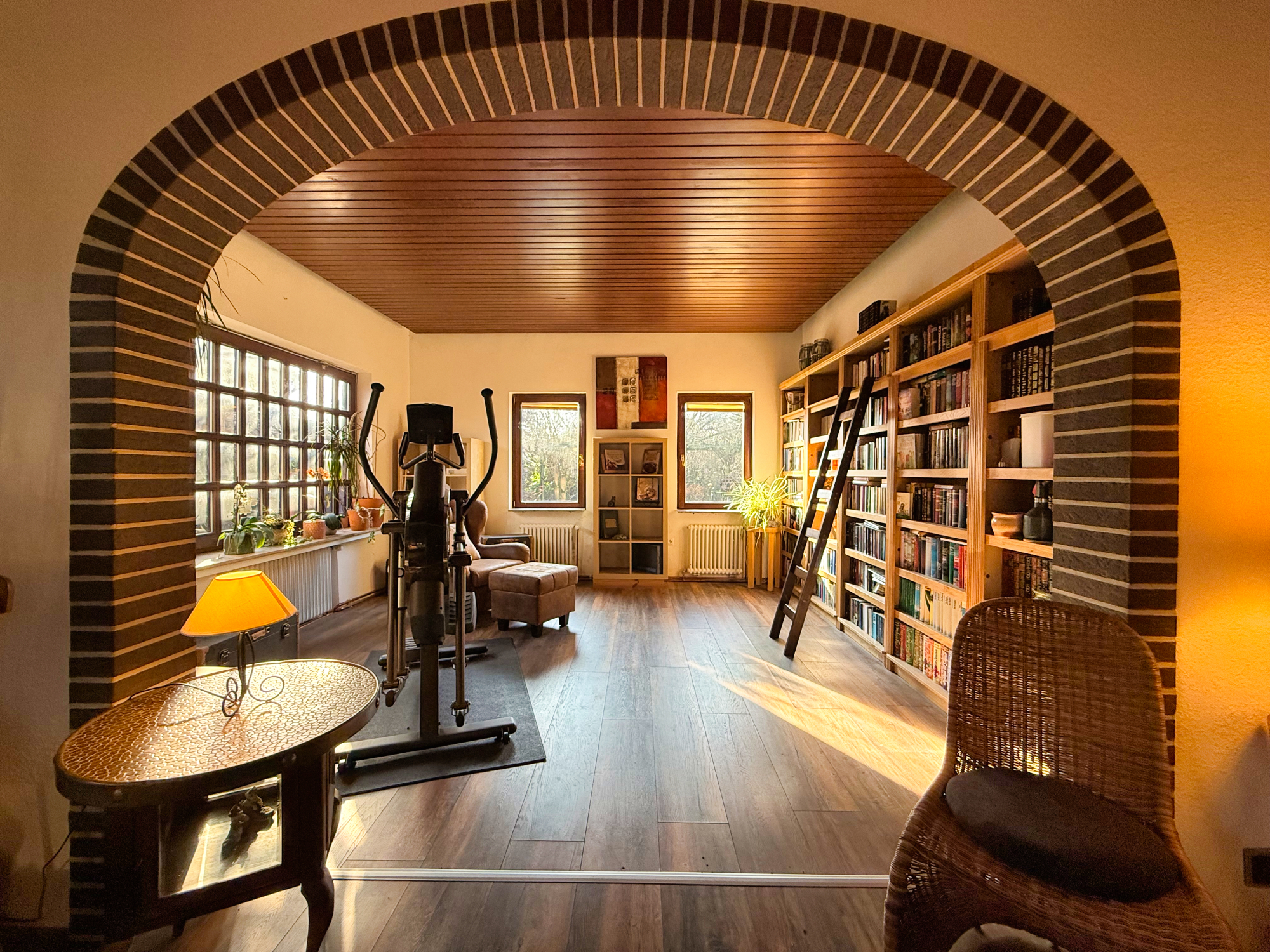 Vom Vorraum gelangen Sie in die helle Küche, die ausreichend Platz für gemeinsame Mahlzeiten bietet. Die Küche führt weiter in das großzügige Wohnzimmer, das mit drei großen Fenstern lichtdurchflutet ist. Hier sorgt ein weiterer Kamin für eine behagliche Atmosphäre. Angrenzend an das Wohnzimmer befindet sich eine helle Bibliothek – ein Rückzugsort zum Lesen oder Arbeiten.