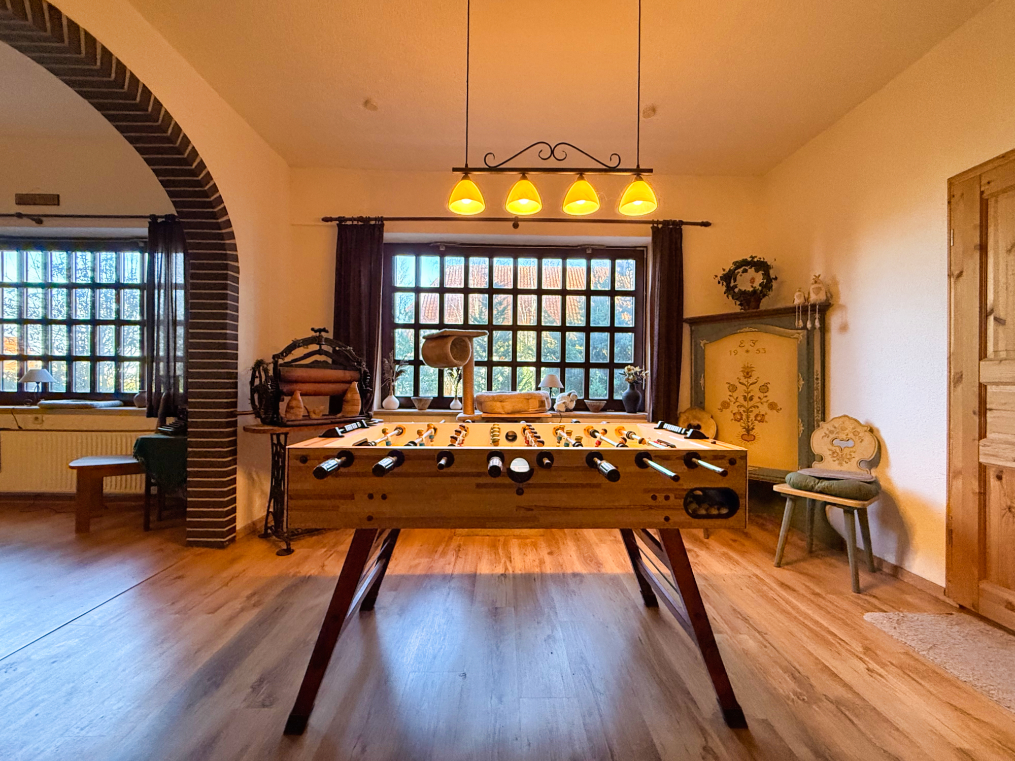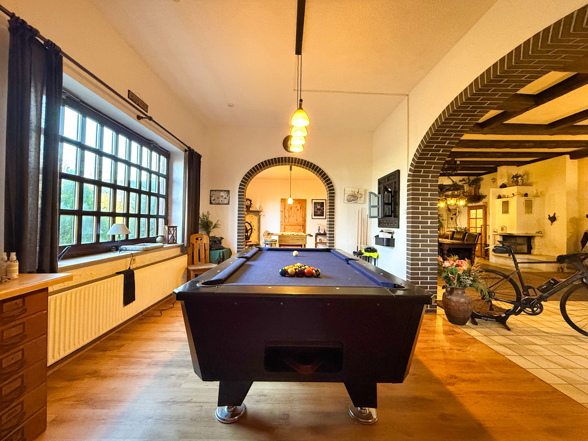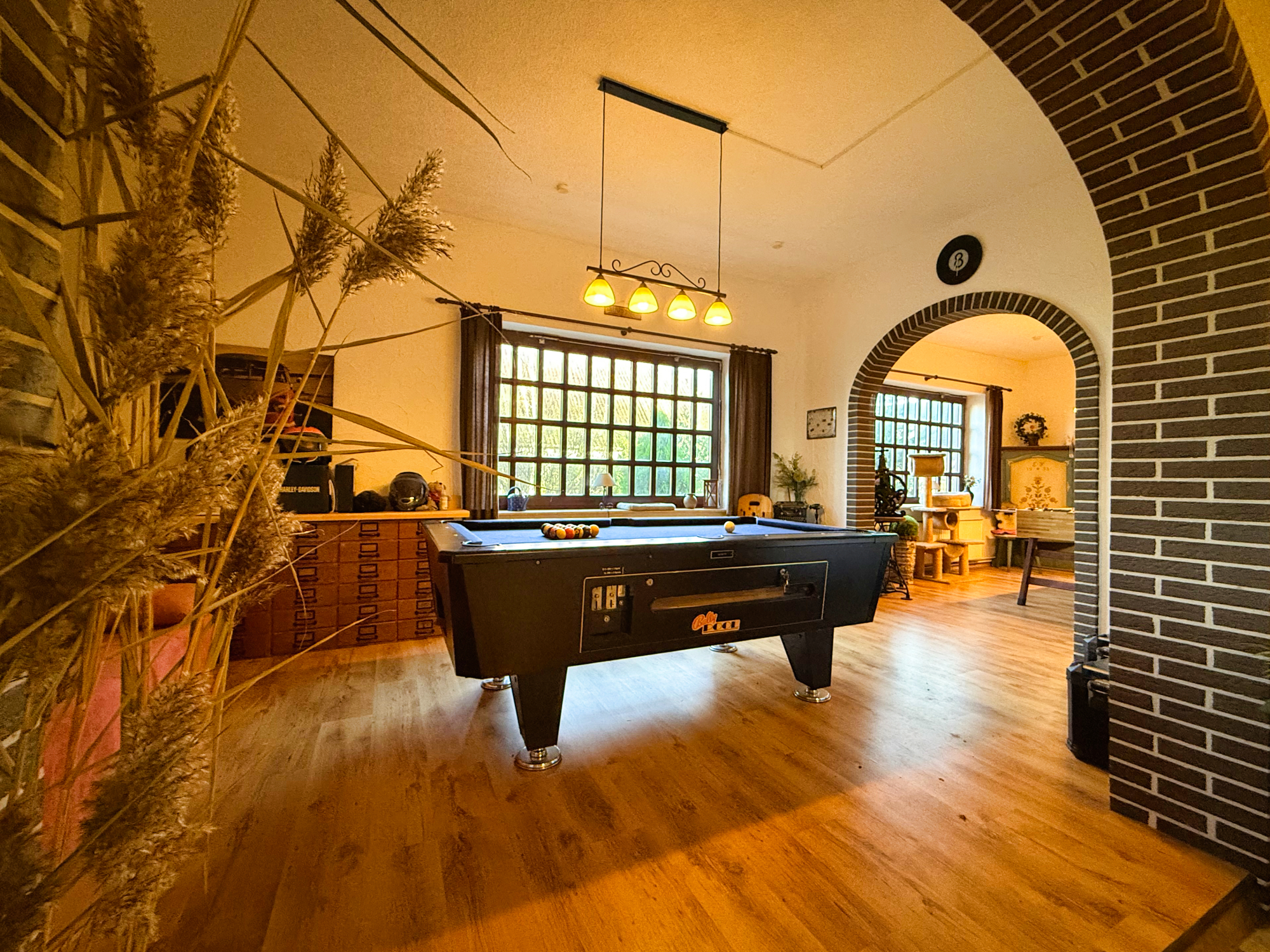 Beim Betreten des Hauses gelangen Sie in eine geräumige Diele, die alle Bereiche des Erdgeschosses miteinander verbindet. Auf der linken Seite befinden sich eine Billiardecke und eine Kickerecke – ideal für Kinder und Jugendliche, die viel Platz zum Spielen und Entspannen suchen. Direkt angrenzend liegt ein helles Schlafzimmer, das sich auch als Gästezimmer eignet.