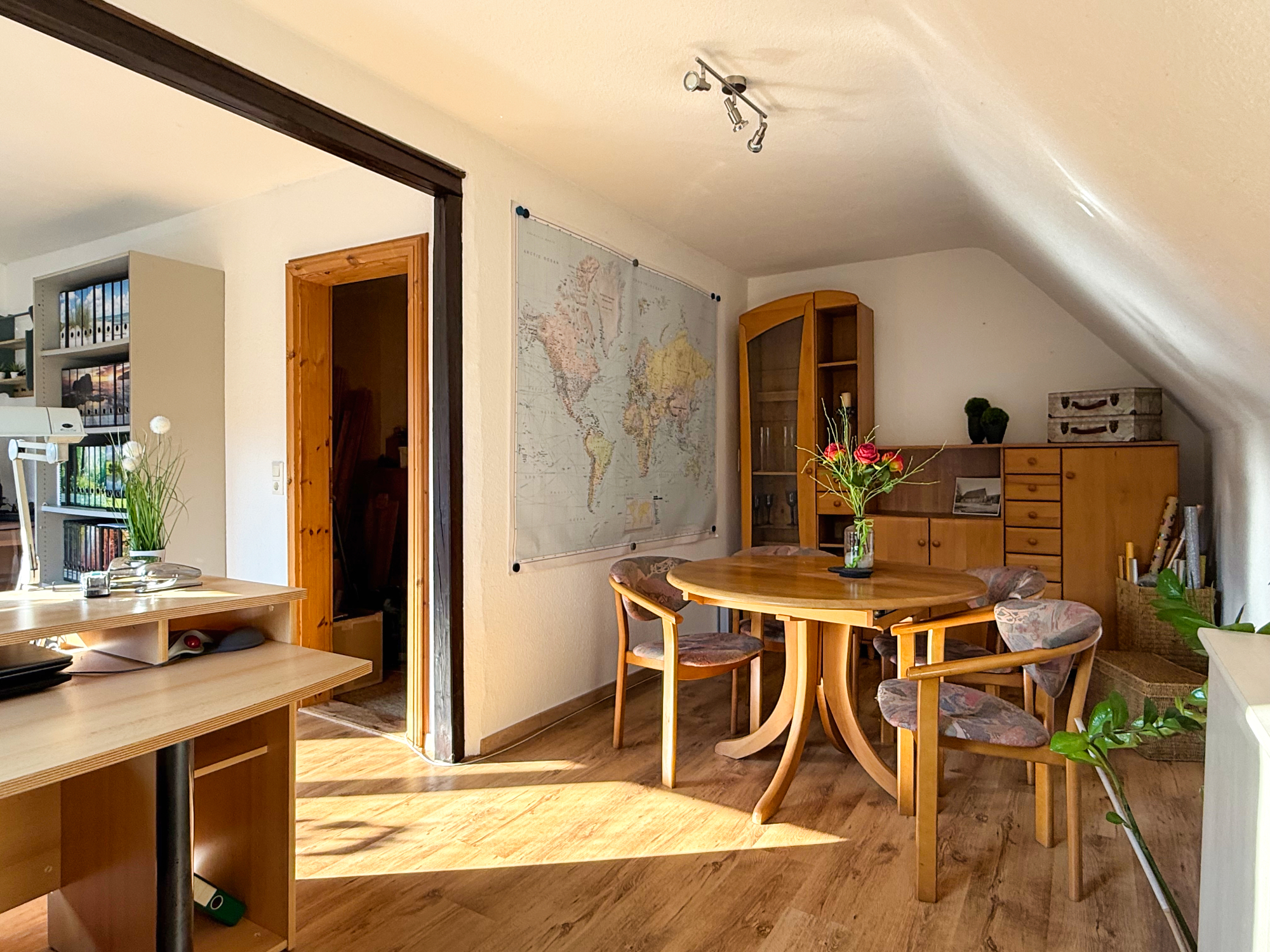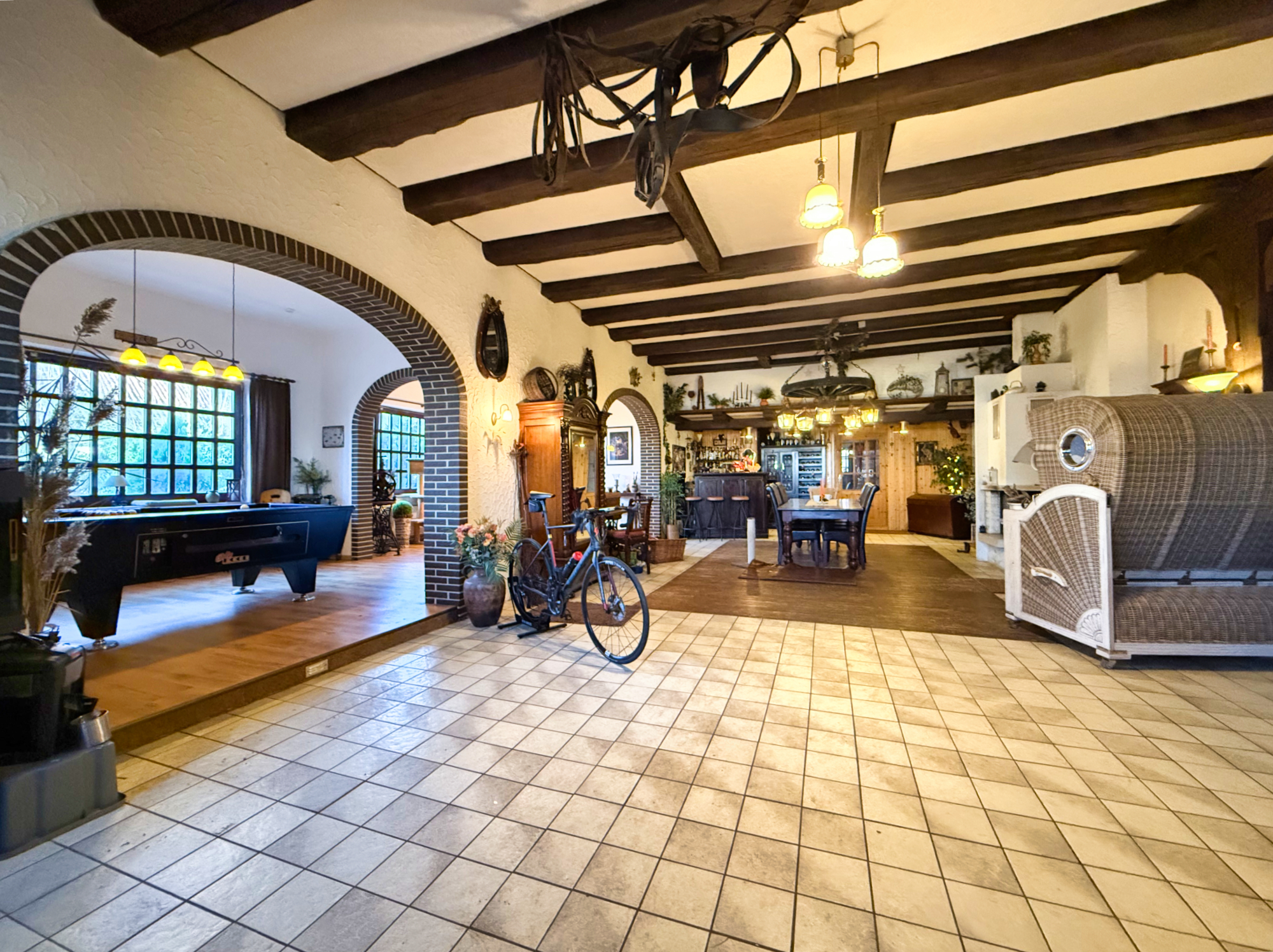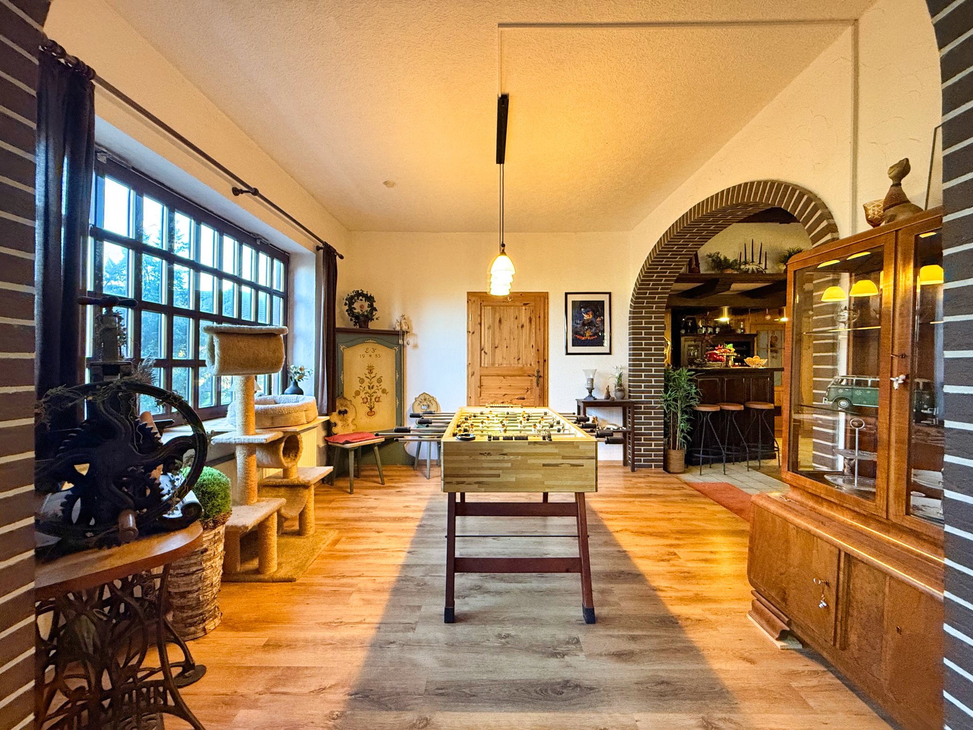 Beim Betreten des Hauses gelangen Sie in eine geräumige Diele, die alle Bereiche des Erdgeschosses miteinander verbindet. Auf der linken Seite befinden sich eine Billiardecke und eine Kickerecke – ideal für Kinder und Jugendliche, die viel Platz zum Spielen und Entspannen suchen. Direkt angrenzend liegt ein helles Schlafzimmer, das sich auch als Gästezimmer eignet.
