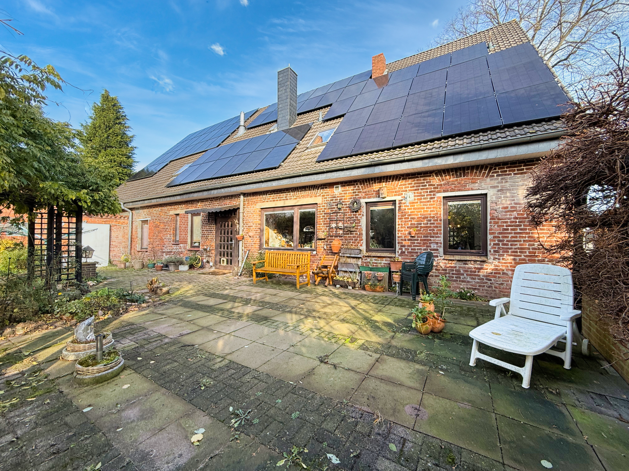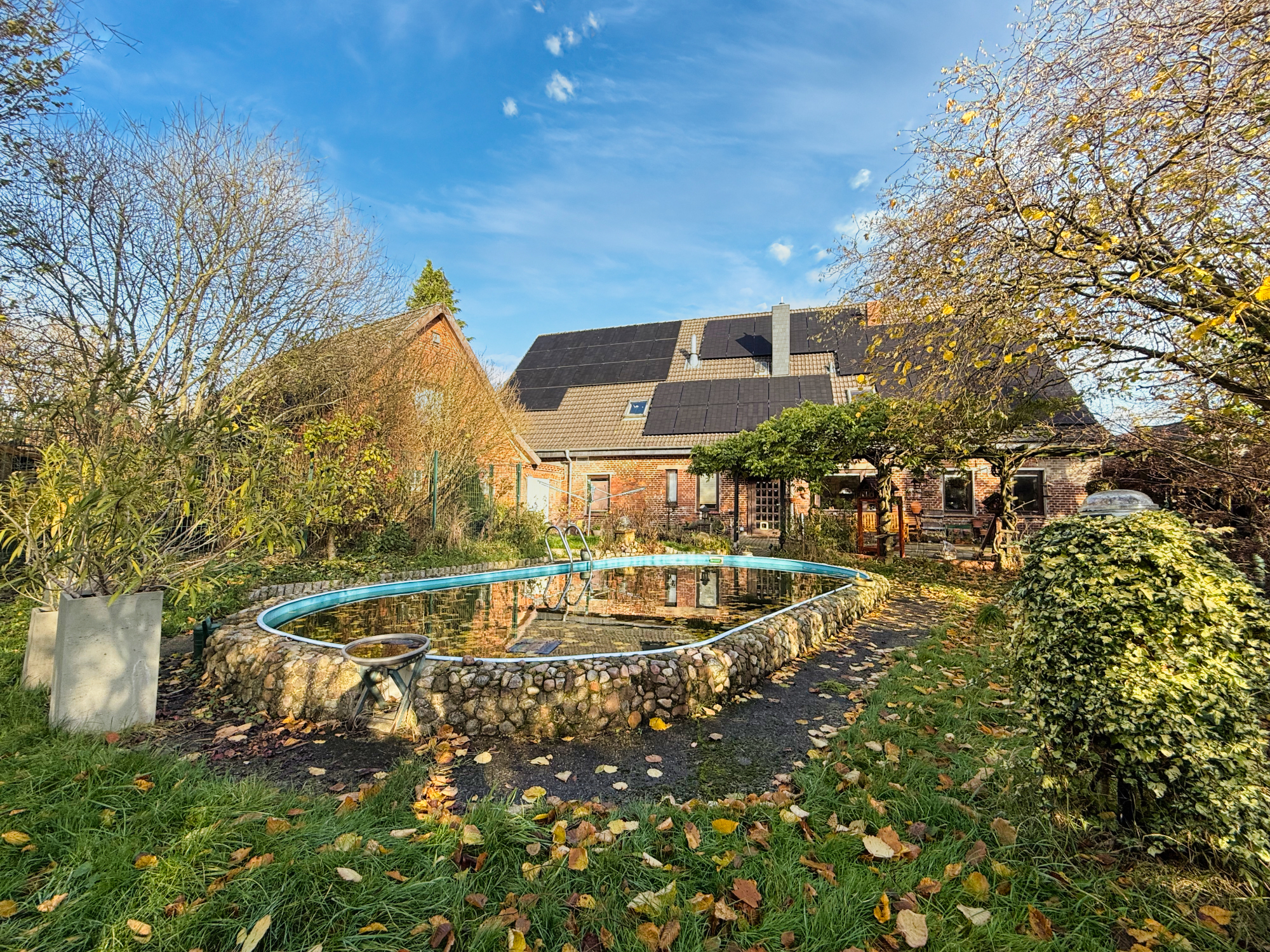 Ein besonderes Highlight ist der ca. 4 x 8 Meter große Pool, der im Sommer für Badespaß und Erholung sorgt. Die großzügige, windgeschützte Terrasse liegt auf der Sonnenseite und ist von außen nicht einsehbar – perfekt für ungestörte Stunden im Freien.