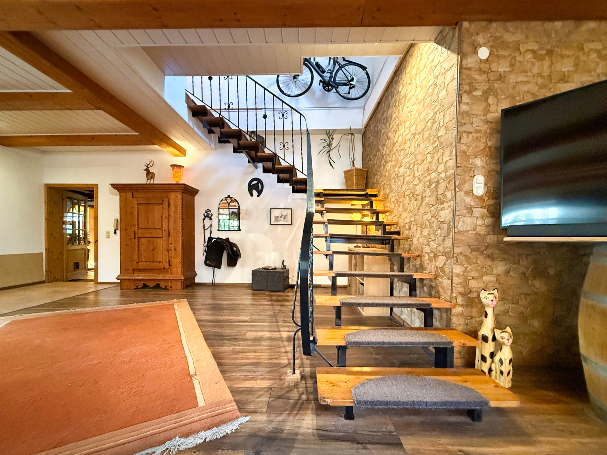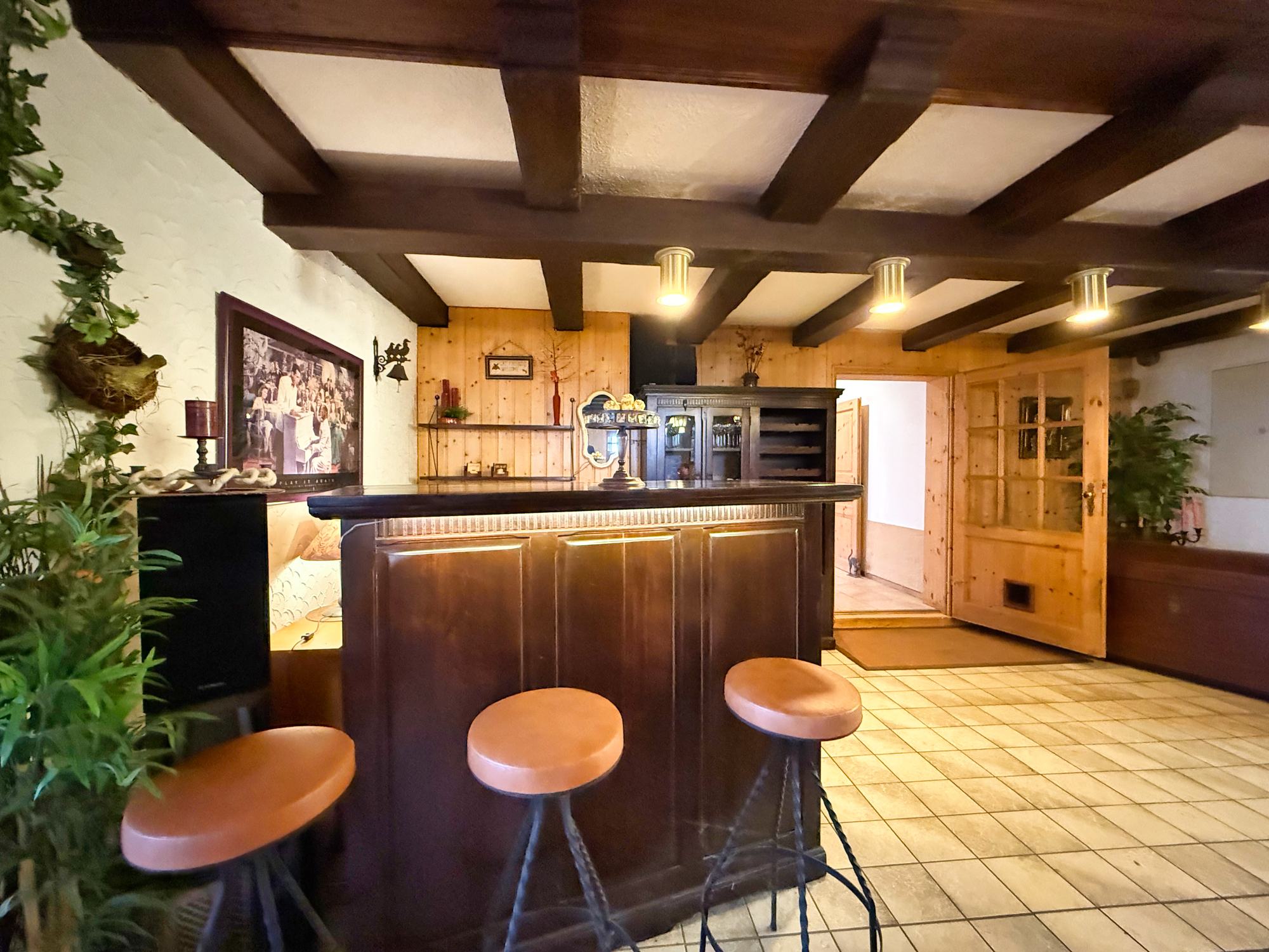 Geradeaus führt die Diele in eine gemütliche Hausbar mit ausreichend Sitzmöglichkeiten, in der ein Kamin für wohlige Wärme sorgt – perfekt für gesellige Abende mit der Familie oder Freunden. Rechts von der Diele befinden sich ein Vorratsraum, ein angrenzendes Ankleidezimmer sowie ein Vorraum mit einem zusätzlichen Zugang zum Haus. Angrenzend befindet sich hier auch ein Badezimmer mit Dusche und Fenster.