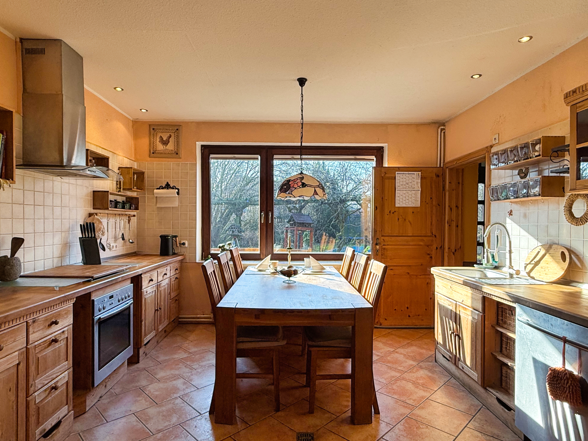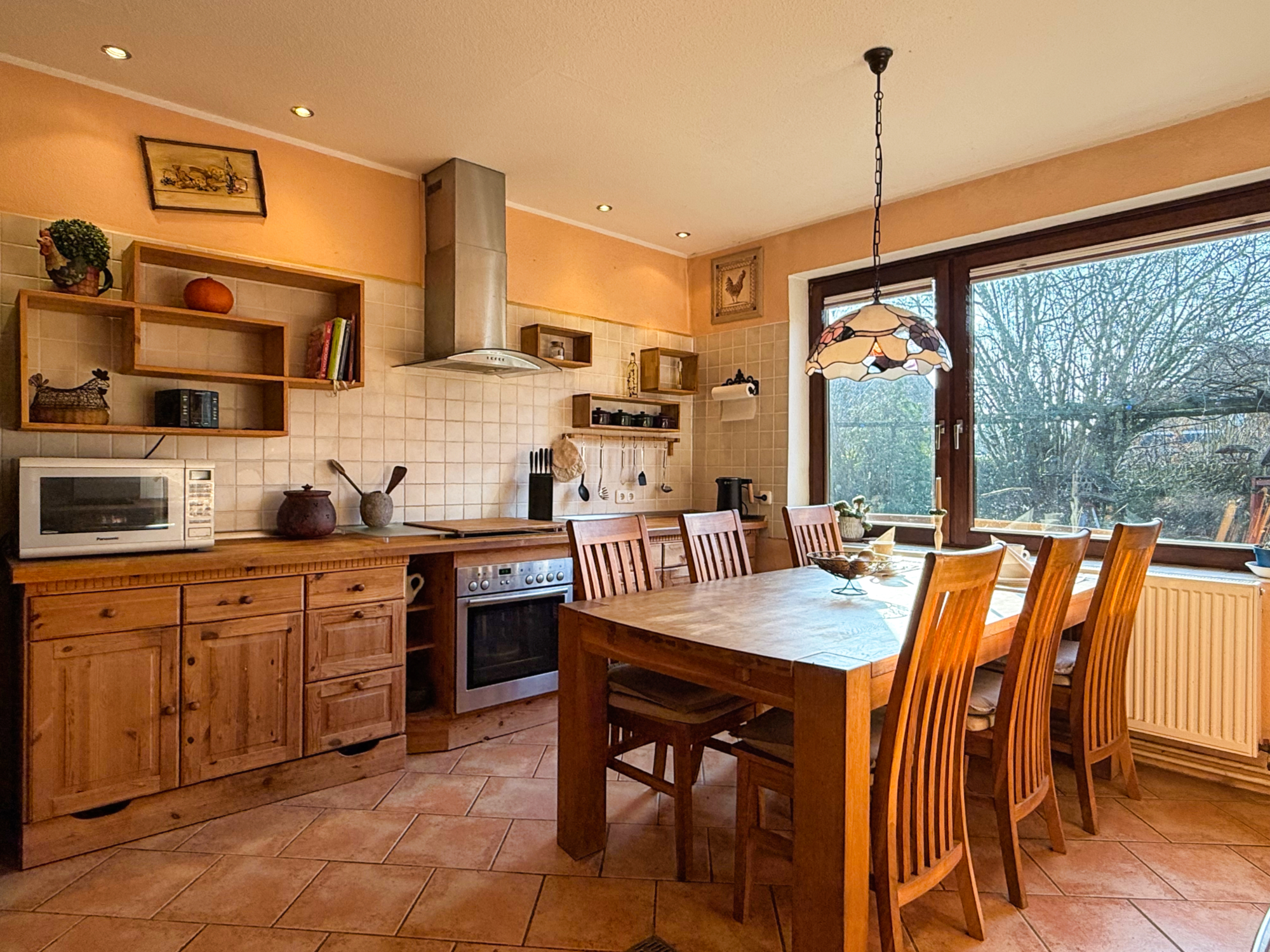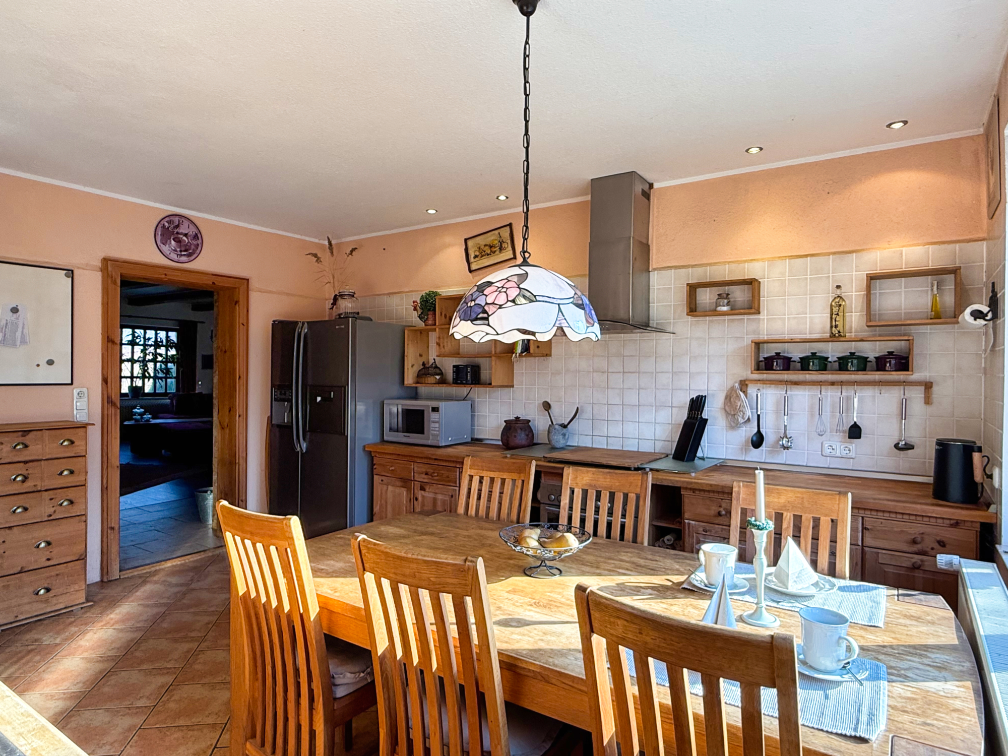 • Küche mit Einbauküche im Landhausstil inkl. E-Geräte (Backofen, Cerankochfeld, Geschirrspühler, Dunstabzugshaube, großer Side-by-Side Kühlschrank
