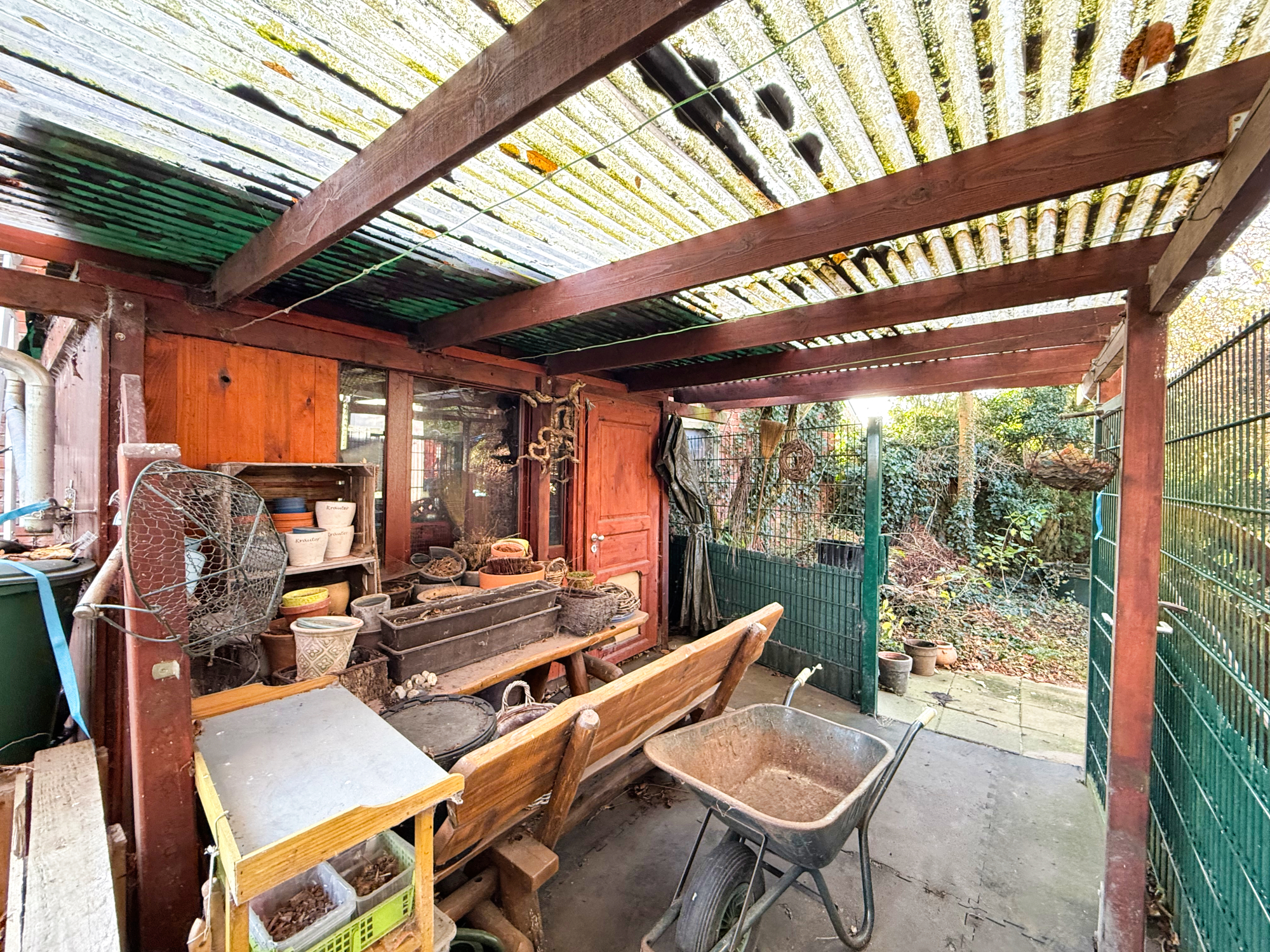 Ein großes Carport mit Platz für zwei Fahrzeuge sowie eine Werkstatt auf zwei Ebenen bieten großzügigen Stauraum und vielfältige Möglichkeiten zur Nutzung, sei es für Hobbys, handwerkliche Projekte oder praktische Zwecke.